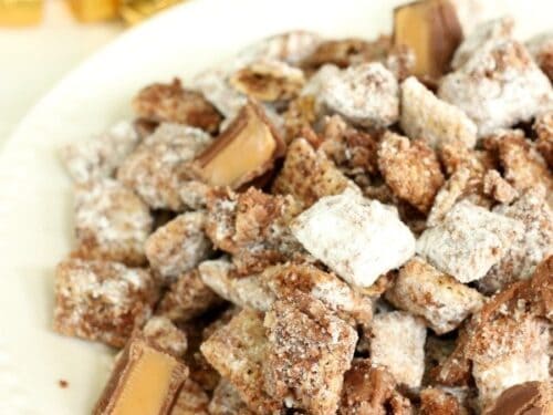 Salted Caramel Muddy Buddies Salted Caramel Muddy Buddies / In a large paper bag add brownie mix and powdered sugar, set aside.